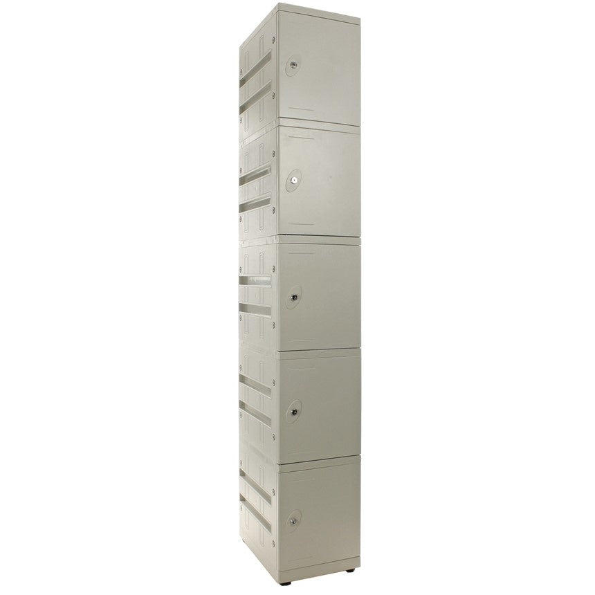 Der 5-türige Kunststoffspind von Locker Concept vereint Stil und Funktionalität für vielseitige Aufbewahrungsmöglichkeiten. Mit einer Türhöhe von 340 mm bietet dieses Modell eine ideale Lösung zur sicheren Aufbewahrung persönlicher Gegenstände. Die Spinde sind vollständig aus hochwertigem ABS-Kunststoff gefertigt und daher beständig gegen Feuchtigkeit, Kratzer und starke Beanspruchung. Perfekt für Fitnessstudios, Schwimmbäder, Schulen und Umkleideräume.